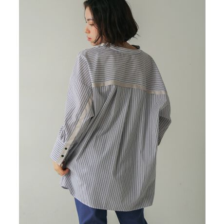 Design: 程よくオーバーサイズで、袖まで通したバックテープラインとたっぷりとったバックタックで後ろ姿にアクセントのあるデザインシャツチュニック。小ぶりのスタンドカラーとサイドのシャツテールで軽さと抜け感をだして、着るだけでこなれ感。重ね着にも最適で、シーズンレスで着用幅が広く重宝します。着脱は前立て釦仕様で、全開して羽織にもなります。