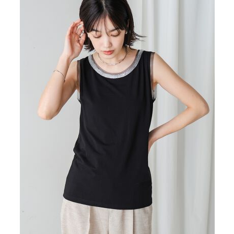 チェーンとシルバーモチーフでアクセントをつけたシンプルタンクトップ。 ネックラインには、チュールとキラキラとしたラメ感のある糸を使用したアビガイルチェーンをレイヤードし、さりげない華やかさをプラス。 一枚インナーに入れるだけで、ネックレスいらずで顔まわりを明るく見せてくれます。
