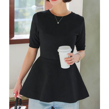 シックな雰囲気漂う大人のペプラムトップス。クルーネックにハーフスリーブのさりげない肌見せは、気になる体型カバーを兼ね備えつつ上品さをプラス。春先から秋口までロングシーズン活躍してくれるサマーニットです。