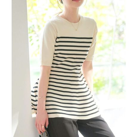 シックな雰囲気漂う大人のペプラムトップス。クルーネックにハーフスリーブのさりげない肌見せは、気になる体型カバーを兼ね備えつつ上品さをプラス。春先から秋口までロングシーズン活躍してくれるサマーニットです。