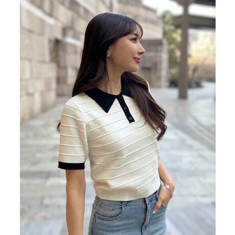 [ 岡部あゆみさんコラボ ]リップルボーダーポロカラーニットトップス [N1129]