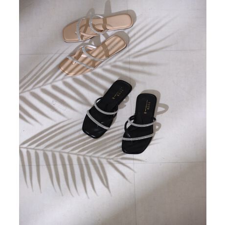 ラインストーンが華やかで、アクセサリー感覚で履ける大人なサンダル。華奢めなストラップでヌーディーな足元を楽しめ、派手になりすぎないのもポイント。フラットなので長時間履いても足が痛くなりにくく、普段使いにぴったり。シンプルデザインで、スタイリングを選ばず取り入れやすいサンダルです。