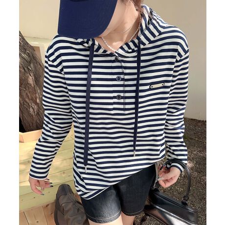 シンプルでありながら目を引くボーダーデザインが特徴的なボタン付きパーカー。多彩なカラーのボーダー柄で他のアイテムとも合わせやすく、アウトドアや日常使いにぴったり。