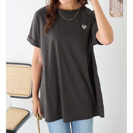 ハート刺繍:胸元にハートをモチーフにしたロゴデザインのワンポイント刺繍をつけたトレンド感あふれるデザイン