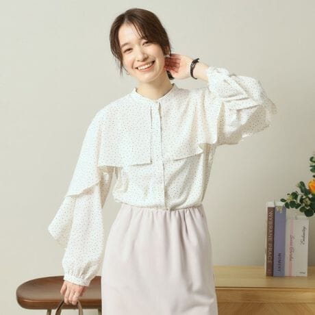 大胆なケープデザインに袖まであしらったフリルが一枚で着映えするブラウス。