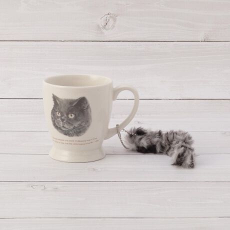 猫のしっぽのようなキーホルダーがついたマグカップ。