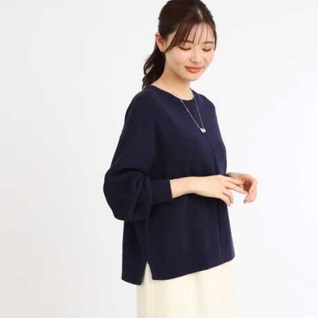 身頃はフラットな天竺編みにセンターラインを入れてポイントにし、袖には凹凸感のある別組織の編地を入れて華やかさを出しております。