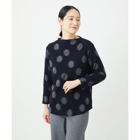 ボトルネック衿にラウンド型の裾ラインは、ジャンニロ人気の定番型のデザインです。素材の表情にマッチした楽しいドット柄デザインに仕上げました。