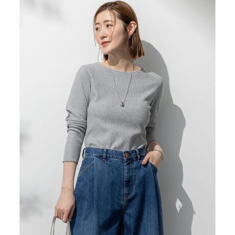 肩幅が大きく見えないよう工夫した、程よいボートネックのラメリブロンTです。袖、裾はロック始末で繊細に仕上げています。1枚ではもちろん、キャミドレスや、デニムジャケットのインナーとしてもオススメの、華やかなアイテムです。合わせやすさと程よいラメ感が嬉しいアイボリー(#002)、大人カジュアルに欠かせないライトグレー系(#003)、の2色展開です。