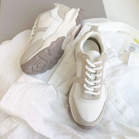 ・異なる素材感、色の微差をセンス良く重ね、スポーティーな中に春らしいニュアンスを込めたスニーカーです