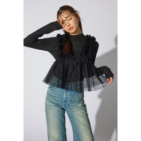 【チュール素材で作った大人可愛いアイテム】■ポイント土台のチュールに沢山のギャザーを入れたフリル布を立体的に叩きつけたビスチェ。■ディテールウエストから下に程よいギャザーを入れて大人可愛いデザインに拘りました。■スタイリング夏は半袖Tシャツの上に、冬はロンTやタートルネックの上に重ねて着れる1年中活躍するアイテム。■生地透け感:あり光沢感:なし伸縮性:なし裏地:なし■商品のお気に入り登録お気に入りアイテムの再入荷・在庫1点などの通知を受け取ることができます。[注意事項]※画像の商品はサンプルです。実際の商品と仕様、加工が若干異なる場合があります。※画像の商品は光の照射や角度、お使いのモニター環境により、実物と色味が異なる場合がございます。※着用、お取り扱いの際は、アテンションタグをご確認ください。