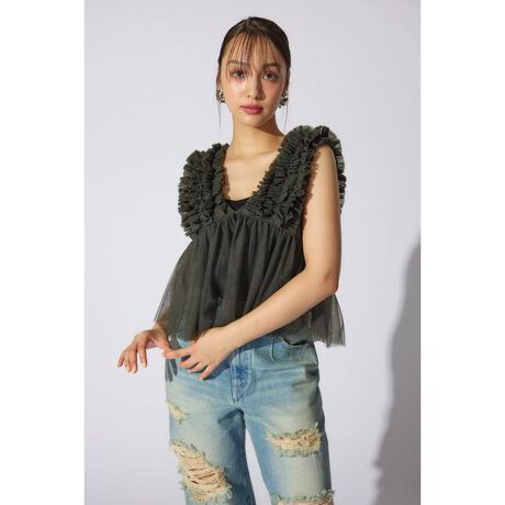 【チュール素材で作った大人可愛いアイテム】■ポイント土台のチュールに沢山のギャザーを入れたフリル布を立体的に叩きつけたビスチェ。■ディテールウエストから下に程よいギャザーを入れて大人可愛いデザインに拘りました。■スタイリング夏は半袖Tシャツの上に、冬はロンTやタートルネックの上に重ねて着れる1年中活躍するアイテム。■生地透け感:あり光沢感:なし伸縮性:なし裏地:なし■商品のお気に入り登録お気に入りアイテムの再入荷・在庫1点などの通知を受け取ることができます。[注意事項]※画像の商品はサンプルです。実際の商品と仕様、加工が若干異なる場合があります。※画像の商品は光の照射や角度、お使いのモニター環境により、実物と色味が異なる場合がございます。※着用、お取り扱いの際は、アテンションタグをご確認ください。