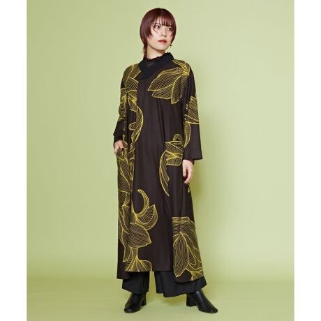 [型番:7CQ-5110-2025]花のモチーフが全身を流れるようにデザインされた着物風ワンピース。落ち着いた色合いながらも、繊細な線画のモチーフに目が惹かれるアイテム。さらりと着られる、ケアも簡単なポリエステル素材。両サイドポケット付き。