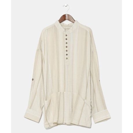 [型番:IMC-5104-2025]南インドの織生地を使用したクルタ型メンズトップス。綿素材で肌触りと通気性が良く、たくさんのポケットがついていて機能性も抜群。ストライプと織柄の組み合わせがポイントの一枚。背中にハンガーループ付き。
