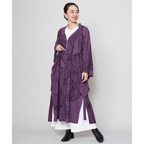 [型番:7CQ-5109-2025]花のモチーフが全身を流れるようにデザインされた着物風羽織。落ち着いた色合いながらも、繊細な線画のモチーフに目が惹かれるアイテム。ベルトとホック付きなので、前開きでゆったり目に着たり、縛ってタイトにしたりとアレンジの効く一着。ケアの簡単なポリエステル素材。両サイドポケット付き。
