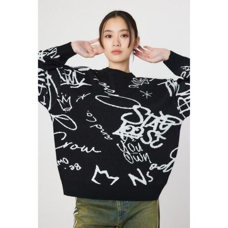 流行りのグラフィティー風のフォントでロゴやメッセージをランダムに落とし込んだ総柄ニットトップス。スタンダードなカラーで柄を落とし込んでいるので、見た目以上にコーディネートに溶け込む一枚。ニットらしいジャガード表現で、ストレスなく着用できます。ボーイズライクにバギーやワイドデニムと合わせたり、ガーリーなコーディネートの外しアイテムとしてもおすすめ。■ポケット:なし■裏地:なし■透け感:なし■伸縮性:なし※ピリングなどが発生した場合は、はさみなどできれいにカットしてください。ニット商品ですので、ハンガー掛けの際、衿元などが伸びる可能性がございます。こまめにハンガーから外すなど、取り扱いには十分ご注意下さい。