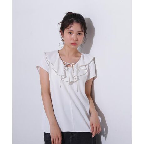 襟ぐりにあしらったラッフルフリルが華やかなブラウス。立体的なラッフルフリルの端に配色をつけたデザインと、華奢なリボンがアクセントになります。肩先をおおったフレンチスリーブの袖丈で、二の腕をほっそり見せながら、一枚でさらっと着こなせます。スカートもパンツも合わせやすくてお勧めです。<詳細>仕様・開閉なし裏地・なし透け感・ややあり / 光沢・なし / 伸縮性・なし 生地の厚さ・普通※モデルの着用画像の場合、光の当たり具合により、実際の色味と異なって見えることがございます。色味は、商品単体の画像をご参照ください。