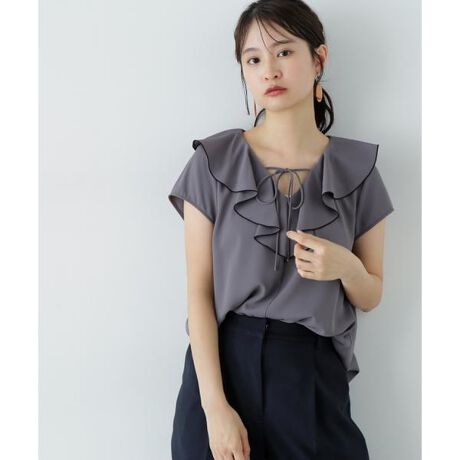 襟ぐりにあしらったラッフルフリルが華やかなブラウス。立体的なラッフルフリルの端に配色をつけたデザインと、華奢なリボンがアクセントになります。肩先をおおったフレンチスリーブの袖丈で、二の腕をほっそり見せながら、一枚でさらっと着こなせます。スカートもパンツも合わせやすくてお勧めです。<詳細>仕様・開閉なし裏地・なし透け感・ややあり / 光沢・なし / 伸縮性・なし 生地の厚さ・普通※モデルの着用画像の場合、光の当たり具合により、実際の色味と異なって見えることがございます。色味は、商品単体の画像をご参照ください。