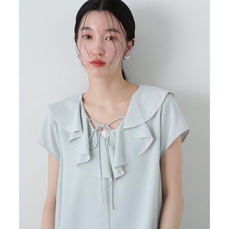 襟ぐりにあしらったラッフルフリルが華やかなブラウス。立体的なラッフルフリルの端に配色をつけたデザインと、華奢なリボンがアクセントになります。肩先をおおったフレンチスリーブの袖丈で、二の腕をほっそり見せながら、一枚でさらっと着こなせます。スカートもパンツも合わせやすくてお勧めです。<詳細>仕様・開閉なし裏地・なし透け感・ややあり / 光沢・なし / 伸縮性・なし 生地の厚さ・普通※モデルの着用画像の場合、光の当たり具合により、実際の色味と異なって見えることがございます。色味は、商品単体の画像をご参照ください。