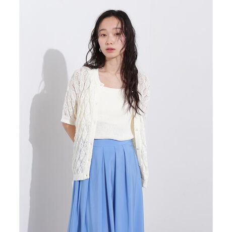 透かし編みニットカーディガンとインナーキャミソールがSETになったアンサンブル。それぞれ編地を変えているので、レイヤードした時に重たくなりすぎないバランスです。カーディガンの前ボタンを開けて羽織ったり、すべてボタンを留めてプルオーバー風にも着こなせます。フェミニンなナロースカート、カジュアルなデニムパンツやカーゴパンツとも着回せます。