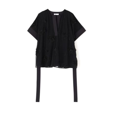 立体的に刺繍された花柄のレース素材を使用したオーバーブラウス。