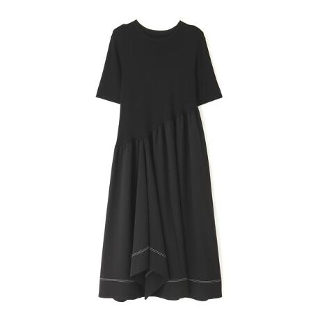 上部が合繊のニット素材、下部がポリエステルのドライな質感が特徴の布帛素材のコンビドレス。
