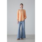襟元をドロップ型に生地をくり抜き、共布の紐と裏側にシアー素材を当てたディティールを入れたブラウスです。
