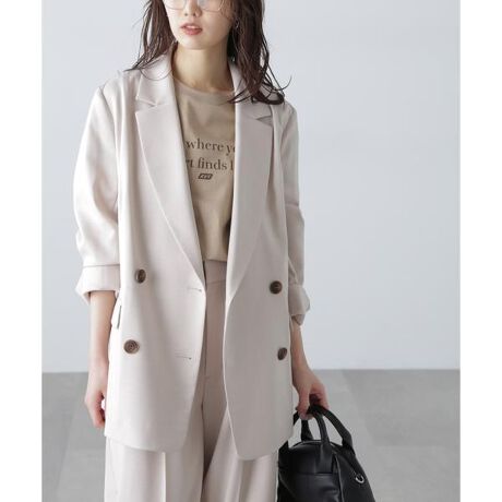 FREE'S MART定番人気のセットアップシリーズです。梳毛(そもう)調合繊生地を使用しており、品がありきれいな目面が特徴。肌触りの良いさらっとした風合いに、ややテンションがあるので着心地もよく、スッキリとした印象です。シワになりにくさも嬉しい。こちらは定番のダブルブレストジャケット型で、襟のバランスを見直し今季らしくアップデートしました。袖口はスリット入りなので、折り返して抜け感を出すのも◎。背裏のみで軽くし、早い時期から着回せます。同素材の梳毛調合繊タックワイドパンツ(店舗商品番号131-5130008)・梳毛調合繊ベルト付きタックショートパンツ(131-5130009)とのセットアップスタイルがおススメ。梳毛調合繊ステッチナローキャミワンピース(131-5140017)と合わせ、レディライクな着こなしも楽しめます。※モデルの着用画像の場合、光の当たり具合により、実際の色味と異なって見えることがございます。色味は、商品単体の画像をご参照ください。