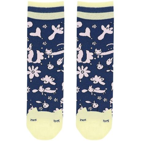 【ソックス】毎日をもっと楽しく過ごせるように。嬉しいとき。不安なとき。ひとりのとき。家族といるとき。どんなときでもHAPPYなものを身につけて、笑顔になってもらいたい。デザイナー“津森千里”氏のそんな気持ちを表現したブランドデザイナー津森千里氏が幼少期に大好きだった本の世界観をモチーフに森の中の動物や植物、夜空に輝く星座をテーマに表現した柄が豊富に揃っています。テーマ:春<ワンダーフォレスト>物語に登場する赤毛の女の子がよく遊ぶ森には不思議なお花がたくさん咲いています。そのお花に集まる鳥やキツネたちに出逢えるワンダーフォレストたくさんのオリジナリティあふれる図柄が、不思議な世界に誘います。・森の妖精たちの柄をジャカードで表現したソックス・つま先部分のネコの顔がデザインポイント