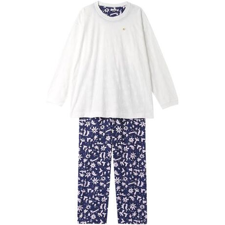 【パジャマ(ロング袖ロングパンツ)】毎日をもっと楽しく過ごせるように。嬉しいとき。不安なとき。ひとりのとき。家族といるとき。どんなときでもHAPPYなものを身につけて、笑顔になってもらいたい。デザイナー“津森千里”氏のそんな気持ちを表現したブランド。デザイナー津森千里氏が幼少期に大好きだった本の世界観をモチーフに森の中の動物や植物、夜空に輝く星座をテーマに表現した柄が豊富に揃っています。テーマ:春<ワンダーフォレスト>物語に登場する赤毛の女の子がよく遊ぶ森には不思議なお花がたくさん咲いています。そのお花に集まる鳥やキツネたちに出逢えるワンダーフォレストたくさんのオリジナリティあふれる図柄が、不思議な世界に誘います。・トップスに綿100%のパイルを、ボトムにループ長の短い綿混のパイルを使用・森の妖精たちをイメージしたファンシーな柄・無地のトップスとプリント柄ボトムの組み合わせ・左胸のネコのワンポイントがデザインのアクセントに【サイズ詳細】M:身幅60.0cm 着丈66.0cm 肩幅54.0cm 袖丈50.0cm ウエスト58.0cm ヒップ97.5cm 股下(レングス)67.0cmL:身幅64.0cm 着丈67.0cm 肩幅55.0cm 袖丈50.0cm ウエスト63.0cm ヒップ101.5cm 股下(レングス)67.0cm※出来上がり寸法を表示しております※サイズ詳細の寸法には多少の差異がございます表面フラッシュにご注意ください台所等で火を扱う場合には、表面の毛羽に引火することがありますので、十分にご注意ください。また、裏返して着用しないでください。「表面フラッシュとは」生地の表面毛羽に着火した火が、毛羽から毛羽へ、非常に早いスピードで、瞬時に火が走る現象です。※アイテムによって柄の出方が異なりますのでご了承ください。