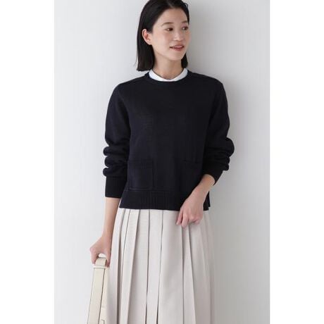 コンパクトなサイズ感にボリュームスリーブがポイントのクルーネックニットです。ポケット使いでカジュアル感をプラス。エポーレットスリーブで切り替えを入れてアクセントにしました。