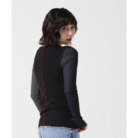 左右の袖が入り違い、身頃も配色、身頃中心つぎメローと裾メローも配色と、さり気なく細部に拘った、他にはないパワーネットチュールインナー。春らしいカラーリングがお勧めなアイテム。柔らかくて、肌触りがとても良い素材で、インナーにピッタリなフィット感。また、身頃は2枚重ねななので、透けすぎないのも嬉しいポイント。身頃両脇も袖と同じ左右配色で、縦長に細見えするデザイン。