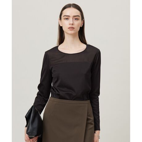 ■デザイン胸から上をシアー素材で切り替えた、コンビデザインの新しいスーツインナートップスです。スーツインでデコルテから顔周りがスッキリ見えるようにシアー素材で切り替えています。シアー素材のオーガンジーもPlaX素材を使用しています。