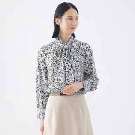 クラシックでエレガントなディテールが特徴です。細めのリボンタイ付き。フロントのサテンパイピングは、プリントのモチーフカラーの1色を抜粋しています。リボンタイ付きなので、きれいめなブラウスとしてジャケットインとしても活躍出来る便利アイテムです。袖口のボタンは、折り返しても着用できる様に、上側にセットしています。