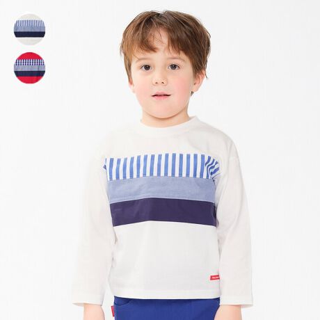 ギンガムチェック柄と無地のブルー系の布帛素材の生地の異素材切替デザイン。少し上品なイメージの長袖Tシャツ、ロンT。【アイテム】トップス カジュアル お洒落 オシャレ かっこいい かわいい 可愛い 普段着 デイリーウェア お出かけ着 お外着 お外遊び着 子ども服 こども服 男児 男の子 ボーイズ キッズ ベビーサイズ トドラーサイズ 幼稚園 保育園 小学校 通園 通学 小学生 2025年春夏物新作 丸高衣料 ロングスリーブ 長袖 ホワイト 白色 レッド 赤色 ムージョンジョン コットン100% 綿100%