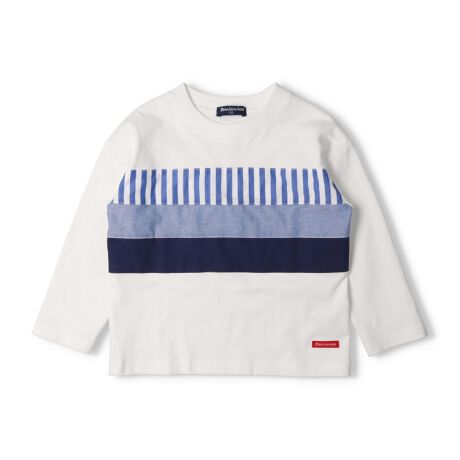 ギンガムチェック柄と無地のブルー系の布帛素材の生地の異素材切替デザイン。少し上品なイメージの長袖Tシャツ、ロンT。【アイテム】トップス カジュアル お洒落 オシャレ かっこいい かわいい 可愛い 普段着 デイリーウェア お出かけ着 お外着 お外遊び着 子ども服 こども服 男児 男の子 ボーイズ キッズ ベビーサイズ トドラーサイズ 幼稚園 保育園 小学校 通園 通学 小学生 2025年春夏物新作 丸高衣料 ロングスリーブ 長袖 ホワイト 白色 レッド 赤色 ムージョンジョン コットン100% 綿100%