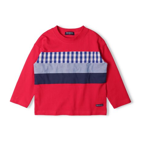 ギンガムチェック柄と無地のブルー系の布帛素材の生地の異素材切替デザイン。少し上品なイメージの長袖Tシャツ、ロンT。【アイテム】トップス カジュアル お洒落 オシャレ かっこいい かわいい 可愛い 普段着 デイリーウェア お出かけ着 お外着 お外遊び着 子ども服 こども服 男児 男の子 ボーイズ キッズ ベビーサイズ トドラーサイズ 幼稚園 保育園 小学校 通園 通学 小学生 2025年春夏物新作 丸高衣料 ロングスリーブ 長袖 ホワイト 白色 レッド 赤色 ムージョンジョン コットン100% 綿100%