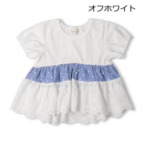 ハート柄の布帛素材と綿レースを組み合わせた配色切替デザインの半袖Tシャツ。レース使いで夏らしさと女の子らしさがプラス。お出かけや普段着にもぴったりなアイテム。襟ぐりの後ろ部分はゴム仕様になっていてお着替えもしやすいです!【アイテム】プレゼント ギフト プルオーバー 赤ちゃん服 ベビー服 贈り物 トップス 無地 シンプル ガーリー カジュアル お洒落 オシャレ かわいい 可愛い 普段着 デイリーウェア お出かけ着 子ども こども 女児 女の子 ガールズ キッズ ベビーサイズ 幼稚園 保育園通園 2025年春夏物新作 丸高衣料 異素材切替 オフホワイト 白色 ピンク キッズズー