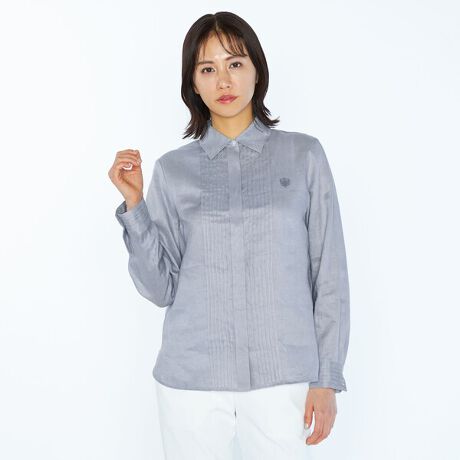 涼しげなシャリ感と上品な光沢感を持ち合わせた麻素材の長袖ブラウス。フロントとカフスのクラシカルなピンタックデザインが、装いに気品を与えてくれます。左胸のロゴ刺繍もさりげないアクセント。すっきりとしたシルエットで、一枚着はもちろん、インナー使いや軽い羽織りとしても着用いただけます。