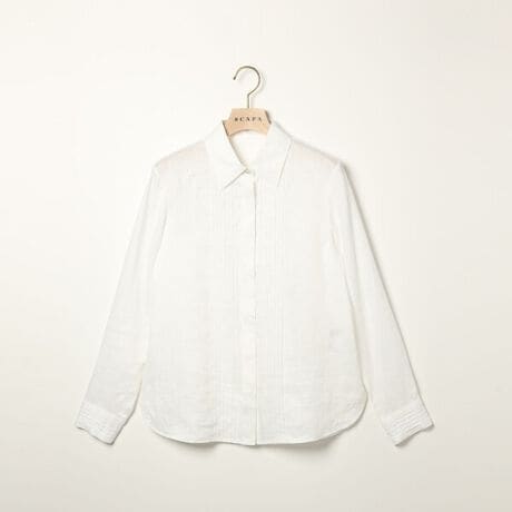 涼しげなシャリ感と上品な光沢感を持ち合わせた麻素材の長袖ブラウス。フロントとカフスのクラシカルなピンタックデザインが、装いに気品を与えてくれます。左胸のロゴ刺繍もさりげないアクセント。すっきりとしたシルエットで、一枚着はもちろん、インナー使いや軽い羽織りとしても着用いただけます。