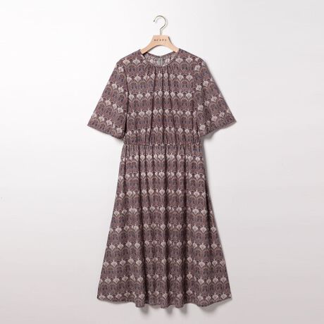 オリエンタルな魅力をまとったリバティプリントのワンピース。ドレープ性のある柔らかな生地を使用しています。シンプルなシルエットで着用シーンを選びにくく、袖とボトム部分の緩やかなフレアライン、首元のタックデザインなどが特徴。一枚で優雅に着こなすほか、ジャケットを重ねたり、お手持ちのベルトでウエストマークするのもおすすめです。
