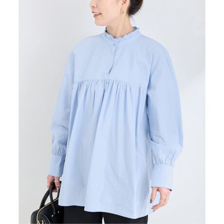 ハリのある薄手の綿素材で、襟元のフリルが華やかなアイテムです。