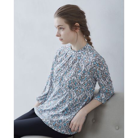 スラブ調素材にタペストリーモチーフの幾何柄をプリントしたカットソー。