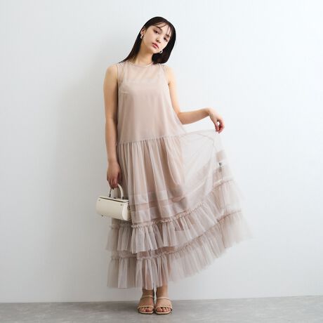 バレリーナをイメージさせるシアーなチュール素材を使用したワンピースはスカート部分にギャザーを寄せたフリルティアードデザインです。