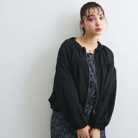 バスト部分は切替えのステッチワークを、裾にはギャザーを寄せて、カジュアルにふれがちなブルゾンを丸みのあるシルエットに仕立てることでフェミニンな印象に。