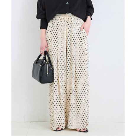 ドットプリントに細かいプリーツをかけた表面感になり、腰回りはゆったりとしたシルエットのため体のラインを拾いすぎず、落ち感のある素材になります。