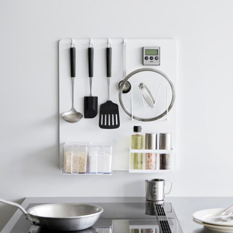 ●キッチンの壁面にフィルムフックで取り付けできるスチールパネルです。