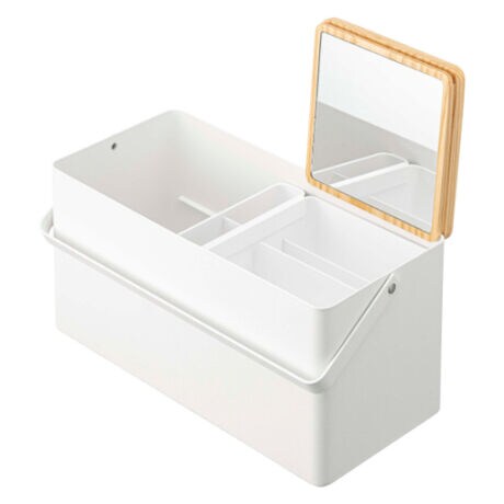 材質/容器:スチール(粉体塗装)、蓋:天然木(ラッカー塗装)、ミラー:2mm厚ガラス、トレー(大・小):ABS樹脂