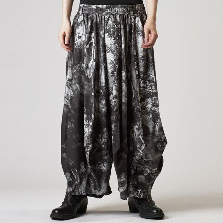 宗教柄をモチーフとした総柄プリント: 他にはない印象的なデザインが、強い存在感を放ちます。