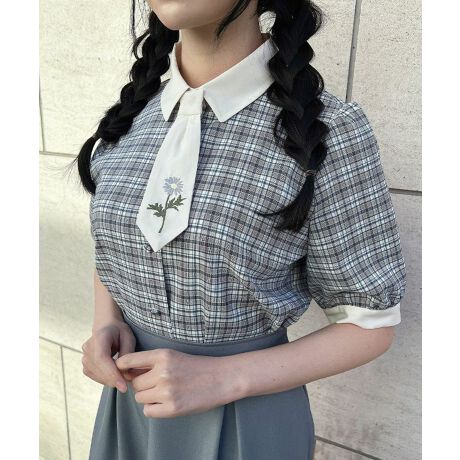 【洗える】マーガレット刺繍タイ付きチェックシャツ